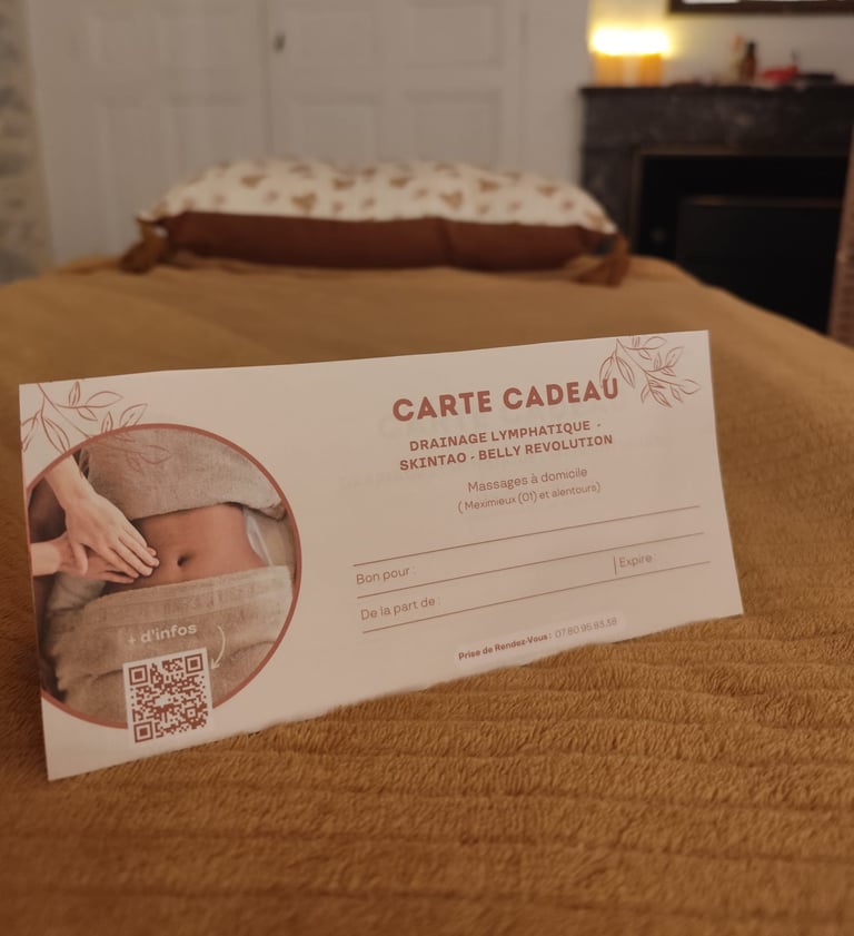 Me déplaçant à domicile, si la destinataire de la carte cadeau habite à + de 10km de Meximieux, des frais de déplacements supplémentaires seront à prévoir en sus.